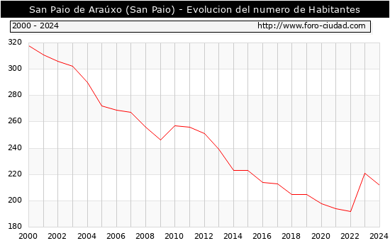 el numero de habitantes en San Paio de Araúxo (San Paio) era de 212, 9 habitantes menos que el en el año 2023. En el grafico siguiente se puede ver cuantos habitantes tiene San Paio de Araúxo (San Paio) a lo largo de los años.