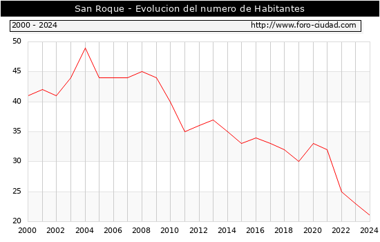 el numero de habitantes en San Roque era de 21, 2 habitantes menos que el en el año 2023. En el grafico siguiente se puede ver cuantos habitantes tiene San Roque a lo largo de los años.
