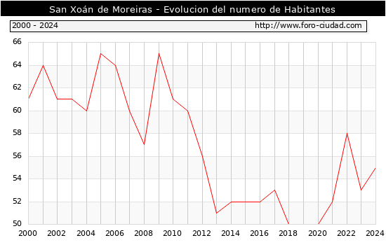 el numero de habitantes en San Xoán de Moreiras era de 55, 2 habitantes mas que el en el año 2023. En el grafico siguiente se puede ver cuantos habitantes tiene San Xoán de Moreiras a lo largo de los años.