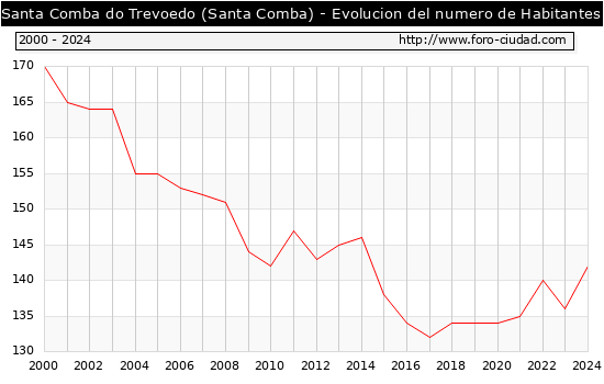 el numero de habitantes en Santa Comba do Trevoedo (Santa Comba) era de 142, 6 habitantes mas que el en el año 2023. En el grafico siguiente se puede ver cuantos habitantes tiene Santa Comba do Trevoedo (Santa Comba) a lo largo de los años.