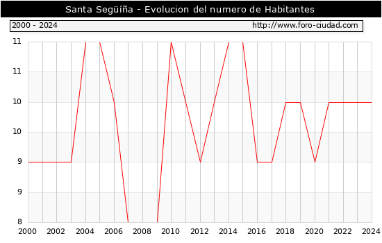 el numero de habitantes en Santa Següíña era de 10, igual numero de habitantes que el en el año 2023. En el grafico siguiente se puede ver cuantos habitantes tiene Santa Següíña a lo largo de los años.