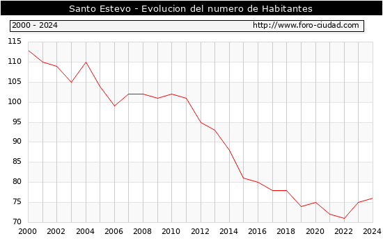 el numero de habitantes en Santo Estevo era de 76, 1 habitantes mas que el en el año 2023. En el grafico siguiente se puede ver cuantos habitantes tiene Santo Estevo a lo largo de los años.