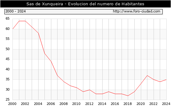 el numero de habitantes en Sas de Xunqueira era de 35, 1 habitantes mas que el en el año 2023. En el grafico siguiente se puede ver cuantos habitantes tiene Sas de Xunqueira a lo largo de los años.