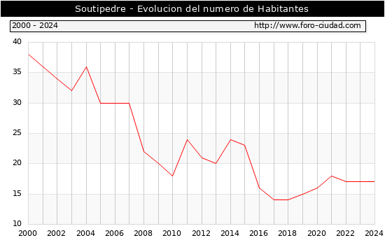 el numero de habitantes en Soutipedre era de 17, igual numero de habitantes que el en el año 2023. En el grafico siguiente se puede ver cuantos habitantes tiene Soutipedre a lo largo de los años.