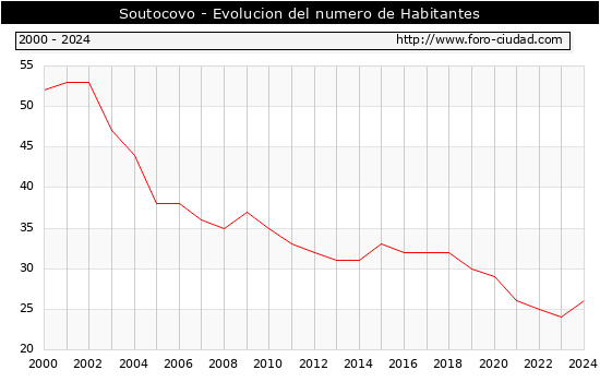 el numero de habitantes en Soutocovo era de 26, 2 habitantes mas que el en el año 2023. En el grafico siguiente se puede ver cuantos habitantes tiene Soutocovo a lo largo de los años.