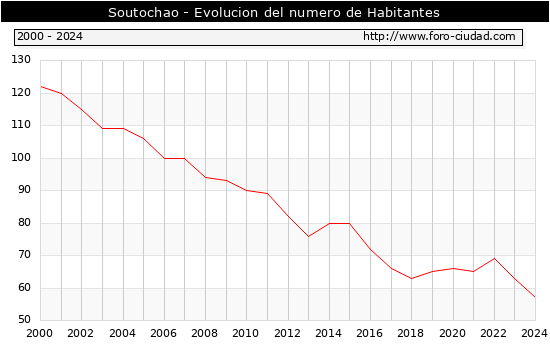 el numero de habitantes en Soutochao era de 57, 6 habitantes menos que el en el año 2023. En el grafico siguiente se puede ver cuantos habitantes tiene Soutochao a lo largo de los años.