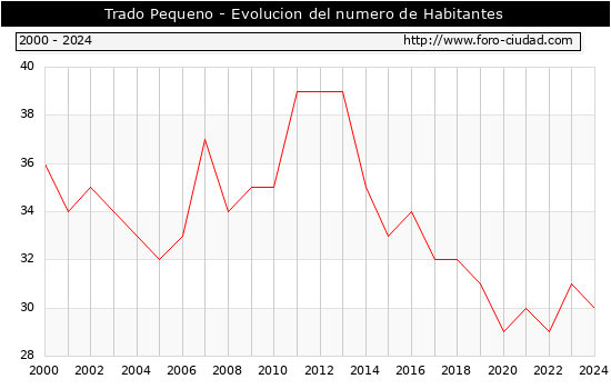 el numero de habitantes en Trado Pequeno era de 30, 1 habitantes menos que el en el año 2023. En el grafico siguiente se puede ver cuantos habitantes tiene Trado Pequeno a lo largo de los años.
