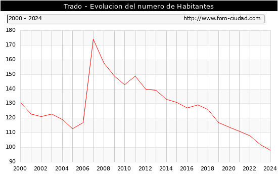 el numero de habitantes en Trado era de 98, 4 habitantes menos que el en el año 2023. En el grafico siguiente se puede ver cuantos habitantes tiene Trado a lo largo de los años.