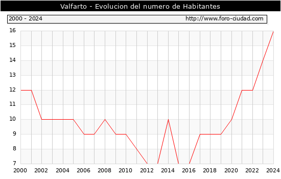 el numero de habitantes en Valfarto era de 16, 2 habitantes mas que el en el año 2023. En el grafico siguiente se puede ver cuantos habitantes tiene Valfarto a lo largo de los años.