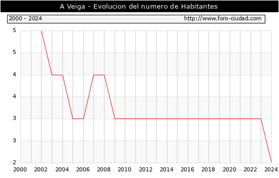 el numero de habitantes en A Veiga era de 2, 1 habitantes menos que el en el año 2023. En el grafico siguiente se puede ver cuantos habitantes tiene A Veiga a lo largo de los años.