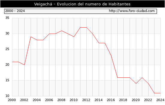 el numero de habitantes en Veigachá era de 11, igual numero de habitantes que el en el año 2023. En el grafico siguiente se puede ver cuantos habitantes tiene Veigachá a lo largo de los años.