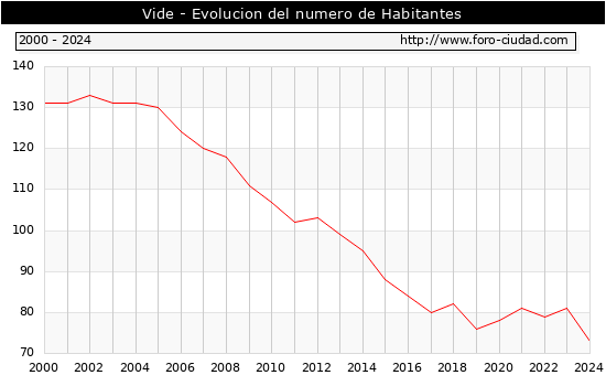 el numero de habitantes en Vide era de 73, 8 habitantes menos que el en el año 2023. En el grafico siguiente se puede ver cuantos habitantes tiene Vide a lo largo de los años.