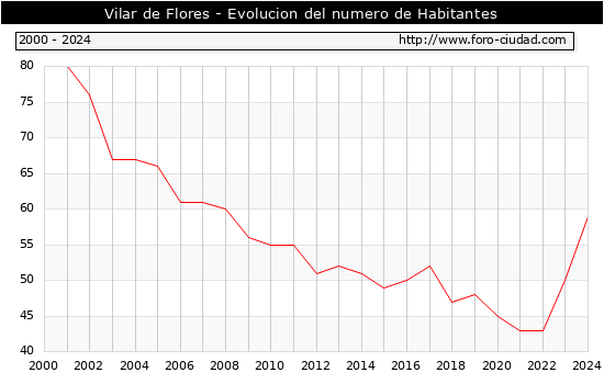 Segun los datos publicados por el INE a 1 de Enero de 2024 el numero de habitantes en Vilar de Flores era de 59, 9 habitantes mas que el en el año 2023. En el grafico siguiente se puede ver cuantos habitantes tiene Vilar de Flores a lo largo de los años.