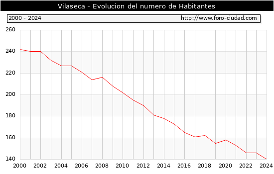 el numero de habitantes en Vilaseca era de 140, 6 habitantes menos que el en el año 2023. En el grafico siguiente se puede ver cuantos habitantes tiene Vilaseca a lo largo de los años.