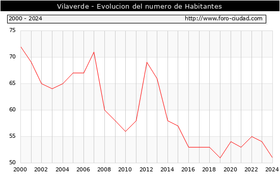 el numero de habitantes en Vilaverde era de 51, 3 habitantes menos que el en el año 2023. En el grafico siguiente se puede ver cuantos habitantes tiene Vilaverde a lo largo de los años.