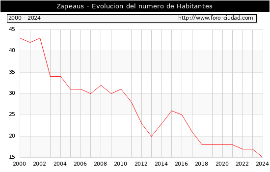 el numero de habitantes en Zapeaus era de 15, 2 habitantes menos que el en el año 2023. En el grafico siguiente se puede ver cuantos habitantes tiene Zapeaus a lo largo de los años.