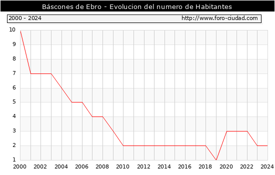 el numero de habitantes en Báscones de Ebro era de 2, igual numero de habitantes que el en el año 2023. En el grafico siguiente se puede ver cuantos habitantes tiene Báscones de Ebro a lo largo de los años.