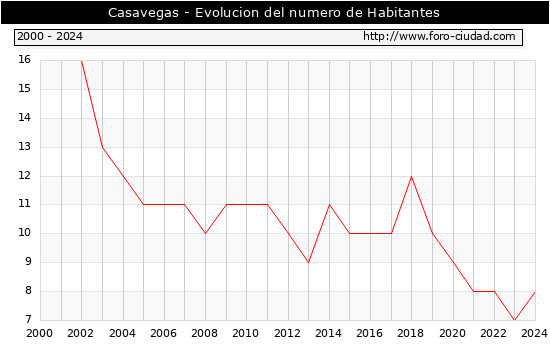 Segun los datos publicados por el INE a 1 de Enero de 2024 el numero de habitantes en Casavegas era de 8, 1 habitantes mas que el en el año 2023. En el grafico siguiente se puede ver cuantos habitantes tiene Casavegas a lo largo de los años.
