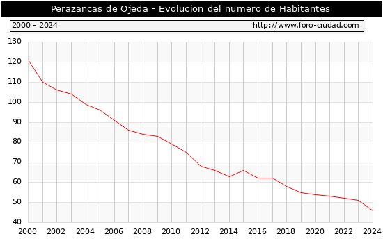 el numero de habitantes en Perazancas de Ojeda era de 46, 5 habitantes menos que el en el año 2023. En el grafico siguiente se puede ver cuantos habitantes tiene Perazancas de Ojeda a lo largo de los años.