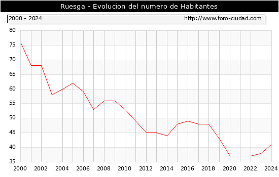 el numero de habitantes en Ruesga era de 41, 3 habitantes mas que el en el año 2023. En el grafico siguiente se puede ver cuantos habitantes tiene Ruesga a lo largo de los años.