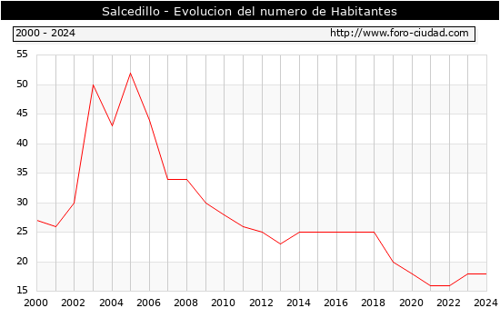 el numero de habitantes en Salcedillo era de 18, igual numero de habitantes que el en el año 2023. En el grafico siguiente se puede ver cuantos habitantes tiene Salcedillo a lo largo de los años.