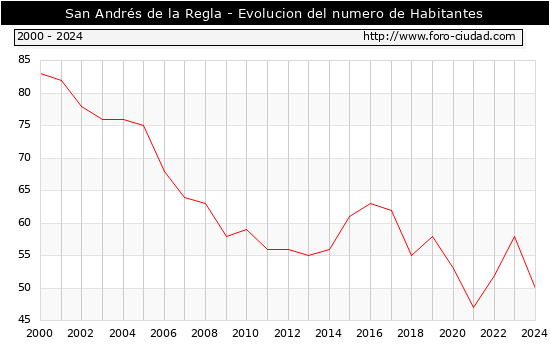 el numero de habitantes en San Andrés de la Regla era de 50, 8 habitantes menos que el en el año 2023. En el grafico siguiente se puede ver cuantos habitantes tiene San Andrés de la Regla a lo largo de los años.