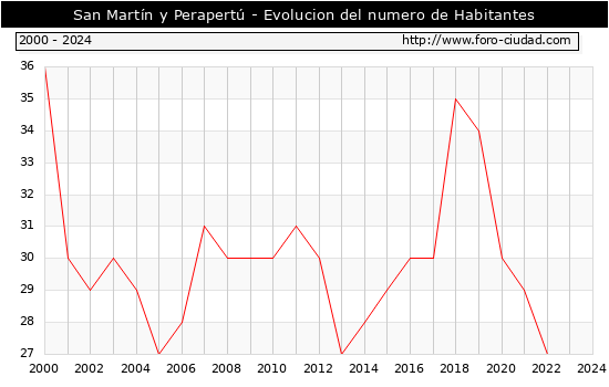 el numero de habitantes en San Martín y Perapertú era de 27, igual numero de habitantes que el en el ańo 2023. En el grafico siguiente se puede ver cuantos habitantes tiene San Martín y Perapertú a lo largo de los ańos.