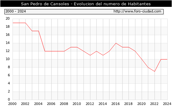 el numero de habitantes en San Pedro de Cansoles era de 10, igual numero de habitantes que el en el año 2023. En el grafico siguiente se puede ver cuantos habitantes tiene San Pedro de Cansoles a lo largo de los años.