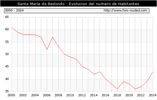 Segun los datos publicados por el INE a 1 de Enero de 2024 el numero de habitantes en Santa María de Redondo era de 43, 4 habitantes mas que el en el año 2023. En el grafico siguiente se puede ver cuantos habitantes tiene Santa María de Redondo a lo largo de los años.