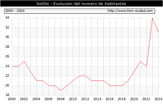 el numero de habitantes en Sotillo era de 31, 3 habitantes menos que el en el año 2023. En el grafico siguiente se puede ver cuantos habitantes tiene Sotillo a lo largo de los años.