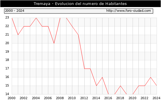 el numero de habitantes en Tremaya era de 15, 1 habitantes menos que el en el año 2023. En el grafico siguiente se puede ver cuantos habitantes tiene Tremaya a lo largo de los años.