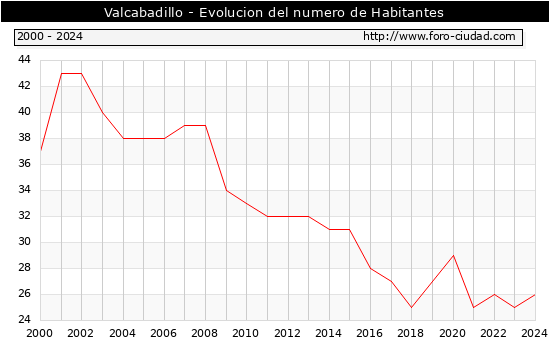 el numero de habitantes en Valcabadillo era de 26, 1 habitantes mas que el en el año 2023. En el grafico siguiente se puede ver cuantos habitantes tiene Valcabadillo a lo largo de los años.