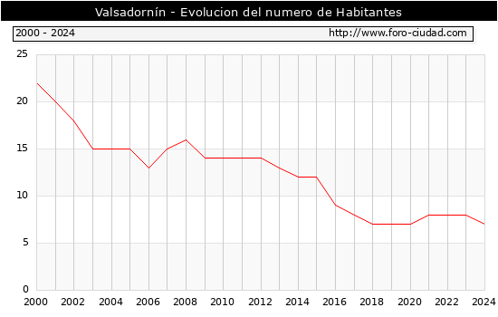Segun los datos publicados por el INE a 1 de Enero de 2024 el numero de habitantes en Valsadornín era de 7, 1 habitantes menos que el en el año 2023. En el grafico siguiente se puede ver cuantos habitantes tiene Valsadornín a lo largo de los años.