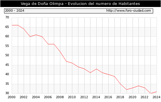 el numero de habitantes en Vega de Doña Olimpa era de 31, 1 habitantes mas que el en el año 2023. En el grafico siguiente se puede ver cuantos habitantes tiene Vega de Doña Olimpa a lo largo de los años.