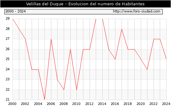 el numero de habitantes en Velillas del Duque era de 25, 2 habitantes menos que el en el año 2023. En el grafico siguiente se puede ver cuantos habitantes tiene Velillas del Duque a lo largo de los años.