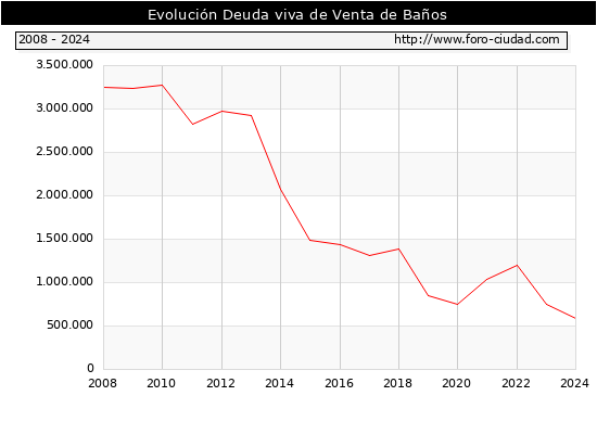 Venta de Baños - Deuda viva del Ayuntamiento a 31/12/2024 Venta de Baños - Deuda viva del Ayuntamiento a 31/12/2024 Segun el Ministerio de Economia y Hacienda el Ayuntamiento de Venta de Baños a 31/12/2024 posee una deuda de 591.000 € . La deuda viva a 31/12/2023 ascendia a 756.000 € por lo que en el ultimo año la deuda se redujo en -165.000 €. ![]()