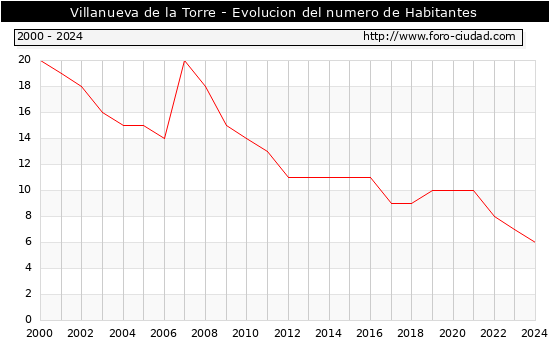 el numero de habitantes en Villanueva de la Torre era de 6, 1 habitantes menos que el en el año 2023. En el grafico siguiente se puede ver cuantos habitantes tiene Villanueva de la Torre a lo largo de los años.