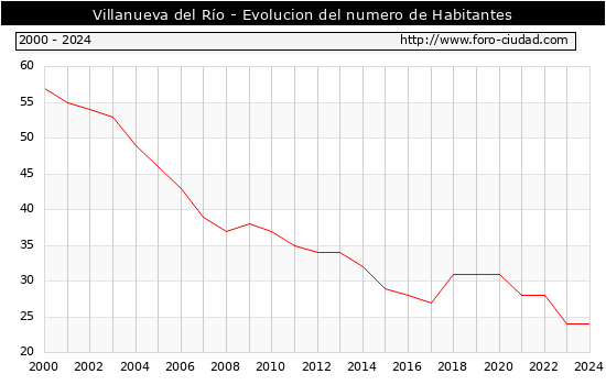 el numero de habitantes en Villanueva del Río era de 24, igual numero de habitantes que el en el año 2023. En el grafico siguiente se puede ver cuantos habitantes tiene Villanueva del Río a lo largo de los años.