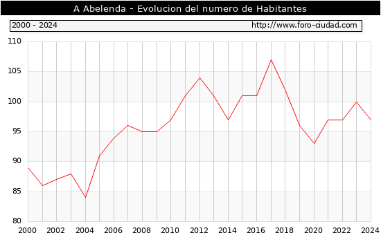 el numero de habitantes en A Abelenda era de 97, 3 habitantes menos que el en el año 2023. En el grafico siguiente se puede ver cuantos habitantes tiene A Abelenda a lo largo de los años.
