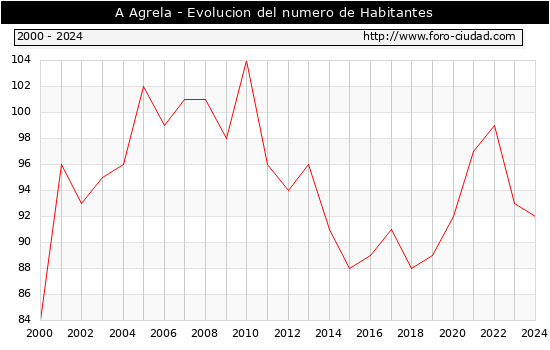 Segun los datos publicados por el INE a 1 de Enero de 2024 el numero de habitantes en A Agrela era de 92, 1 habitantes menos que el en el año 2023. En el grafico siguiente se puede ver cuantos habitantes tiene A Agrela a lo largo de los años.