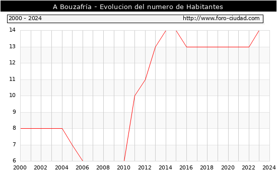 el numero de habitantes en A Bouzafría era de 14, igual numero de habitantes que el en el año 2023. En el grafico siguiente se puede ver cuantos habitantes tiene A Bouzafría a lo largo de los años.