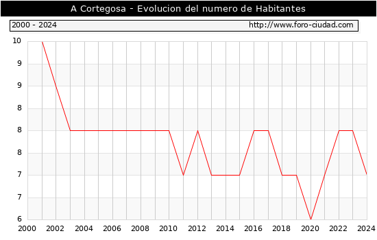 el numero de habitantes en A Cortegosa era de 7, 1 habitantes menos que el en el año 2023. En el grafico siguiente se puede ver cuantos habitantes tiene A Cortegosa a lo largo de los años.