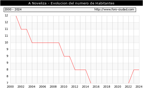 el numero de habitantes en A Noveliza era de 8, igual numero de habitantes que el en el año 2023. En el grafico siguiente se puede ver cuantos habitantes tiene A Noveliza a lo largo de los años.