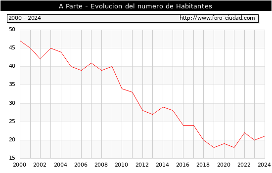 el numero de habitantes en A Parte era de 21, 1 habitantes mas que el en el año 2023. En el grafico siguiente se puede ver cuantos habitantes tiene A Parte a lo largo de los años.