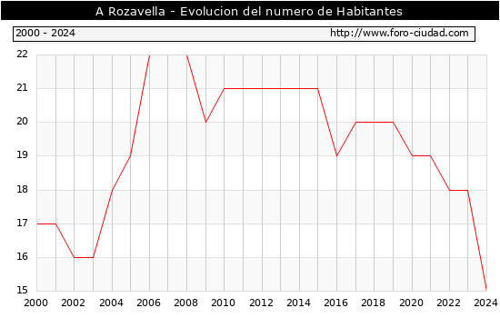 el numero de habitantes en A Rozavella era de 15, 3 habitantes menos que el en el año 2023. En el grafico siguiente se puede ver cuantos habitantes tiene A Rozavella a lo largo de los años.
