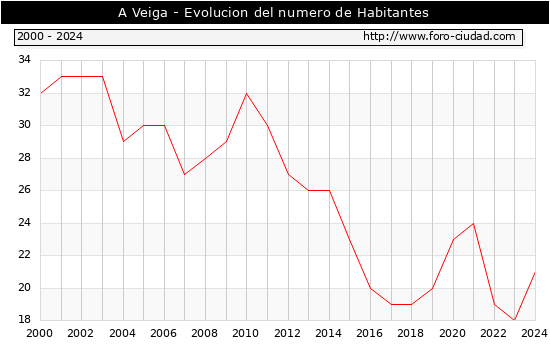 el numero de habitantes en A Veiga era de 21, 3 habitantes mas que el en el año 2023. En el grafico siguiente se puede ver cuantos habitantes tiene A Veiga a lo largo de los años.