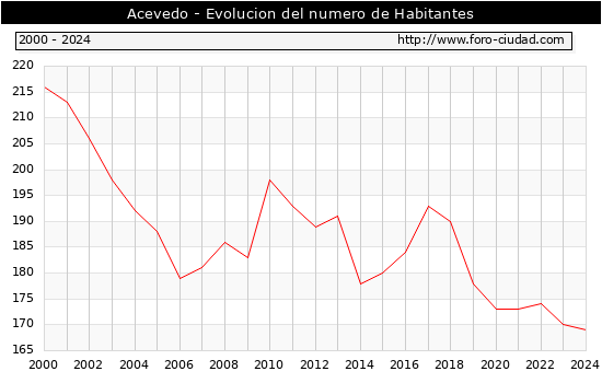 el numero de habitantes en Acevedo era de 169, 1 habitantes menos que el en el año 2023. En el grafico siguiente se puede ver cuantos habitantes tiene Acevedo a lo largo de los años.