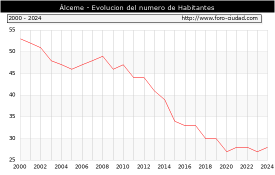 el numero de habitantes en Álceme era de 28, 1 habitantes mas que el en el año 2023. En el grafico siguiente se puede ver cuantos habitantes tiene Álceme a lo largo de los años.