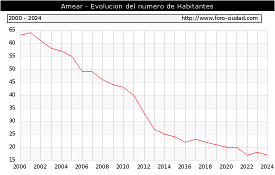 el numero de habitantes en Amear era de 17, 1 habitantes menos que el en el año 2023. En el grafico siguiente se puede ver cuantos habitantes tiene Amear a lo largo de los años.