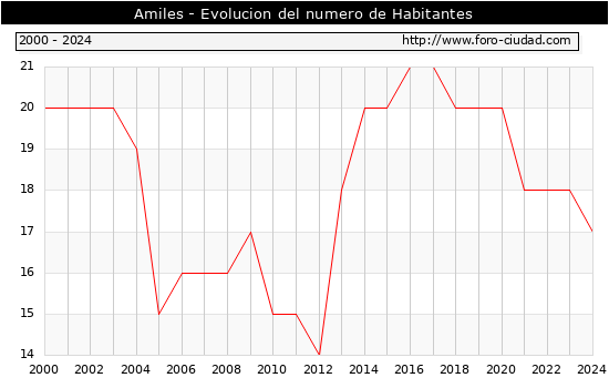 el numero de habitantes en Amiles era de 17, 1 habitantes menos que el en el año 2023. En el grafico siguiente se puede ver cuantos habitantes tiene Amiles a lo largo de los años.